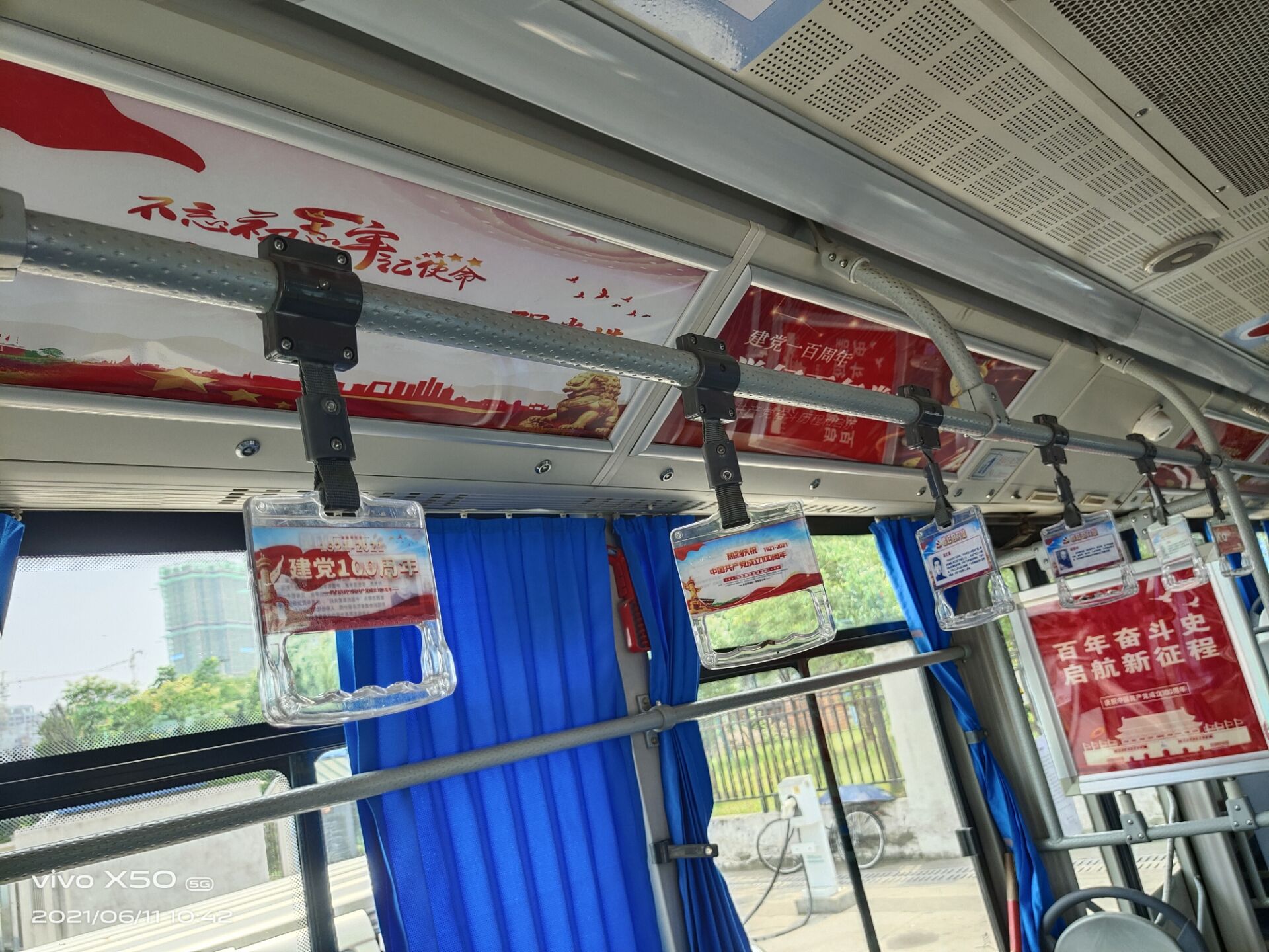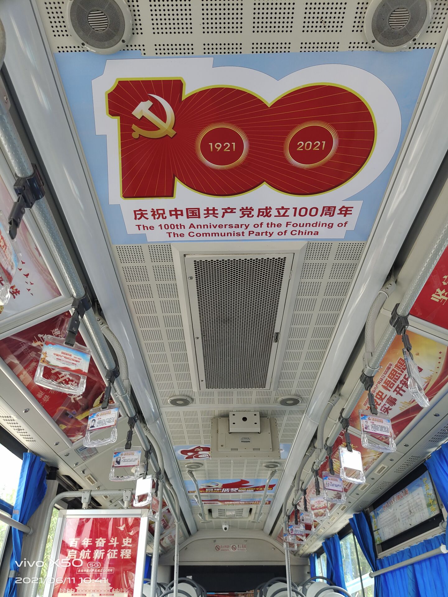 車廂內(nèi)以建黨100周年及黨史內(nèi)容為宣傳主素材,利用公交車內(nèi)、外部車體、吊環(huán)、車頂?shù)容d體,通過圖片、文字、造型車貼等形式宣傳黨建文化知識,將黨建知識融入到生產(chǎn)運(yùn)營中,內(nèi)容豐富、形式新穎,有力地營造了“以黨建促品牌、以品牌帶黨建”的良好創(chuàng)建氛圍。